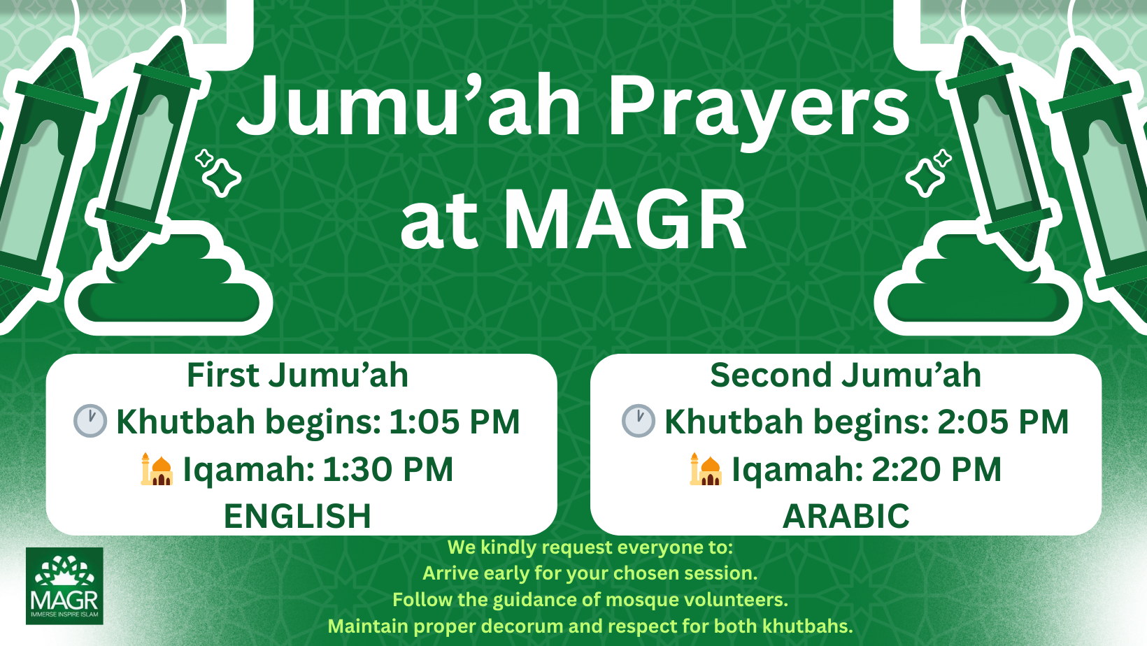 | Friday Khutbah 1st | 12:05 PM |