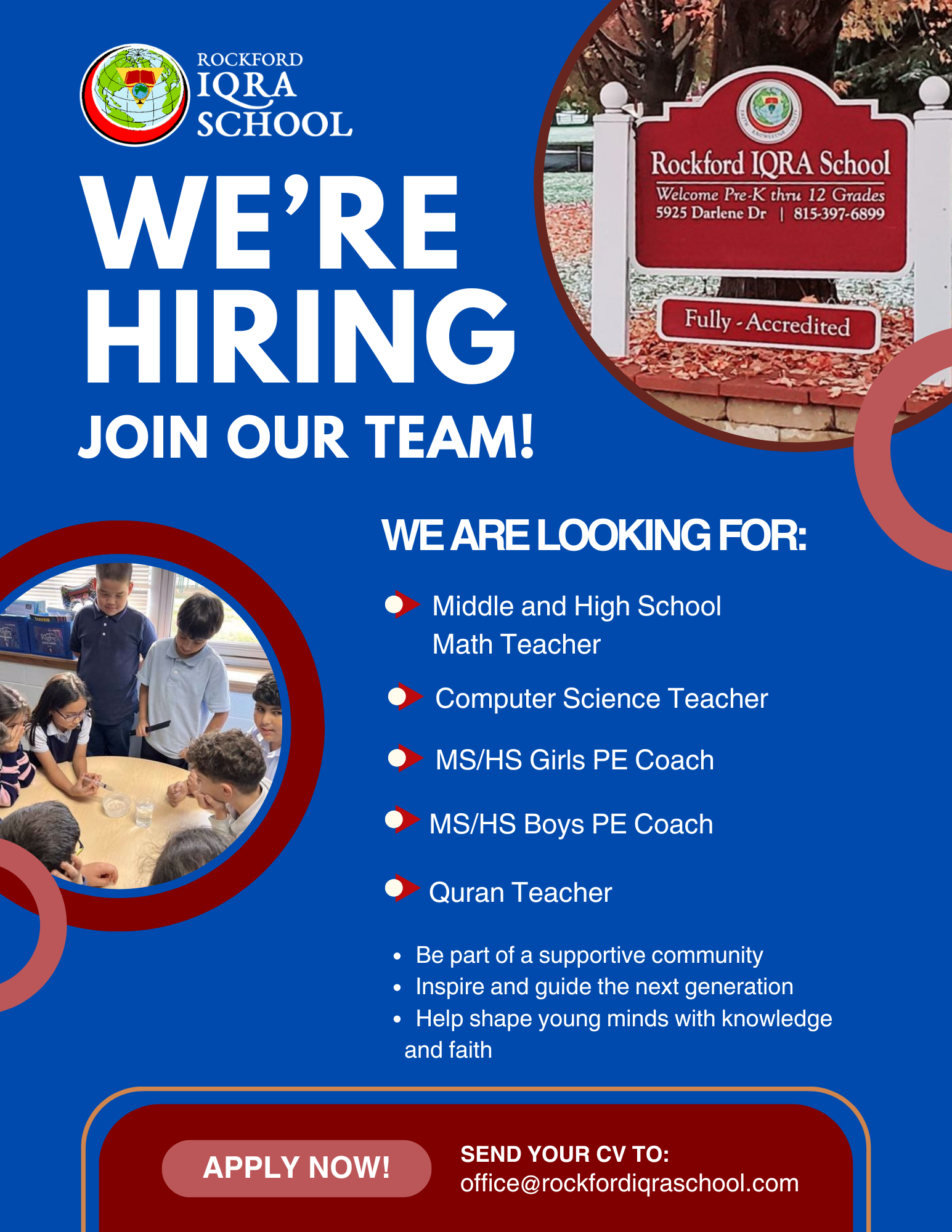 Rockford Iqra’ School was established in 1998 to provide academic and Islamic education for students in the Rockford Area. The objective of this school is to offer college preparatory curriculum to students, who will be ready to step into this world with a strong Muslim identity, Insha’Allah (God Willing), armed with the knowledge of this world and with a moral character and principles espoused by Islam.